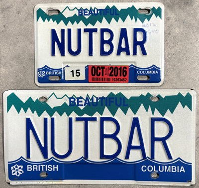 Of the first 2,000 applications only fifty-five were to be rejected, including “IMEASY,” “IM4SEX,” “HOOKER,” and “GORF” (frog backwards – a cultural insult in Canada). Over the years there has been almost no change to the design of the personalized plates. The now familiar mountain-ocean graphic was the first graphic base plate ever issued in the province. Astrographic Industries Ltd. took over production of the plates in the mid-1980s when it won the contract to supply all of the province’s license plates.